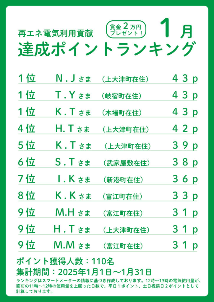 五島で生まれた再エネをみんなで育てようキャンペーン 【1月分】達成ポイントランキング発表!(3/6)